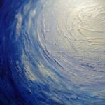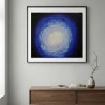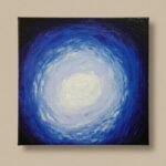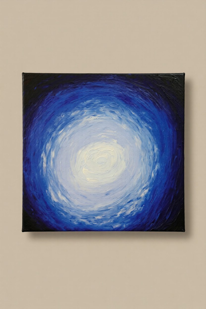 In Moon Rippling, the artist moves away from the figurative “creature” to explore pure, radiating energy. The composition is a masterful study of concentric motion, centered around a luminous, pale-blue core that feels like the heart of a cold star or a moon reflected in dark water. The light spirals outward in thick, sculpted ridges of impasto, transitioning from soft whites into electric cerulean and finally into the deep, midnight indigos of the canvas’s edge. The heavy texture gives the painting a physical “pulse.” Each stroke of the palette knife creates a ripple that catches the light, making the entire surface feel as though it is vibrating or slowly rotating. It is a meditation on the far-reaching impact of a single point of light—a visual representation of how a moment of clarity or a single soul can “ripple” out and illuminate the vast, surrounding darkness. “Even the smallest light creates a wave that never truly ends.”