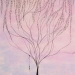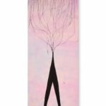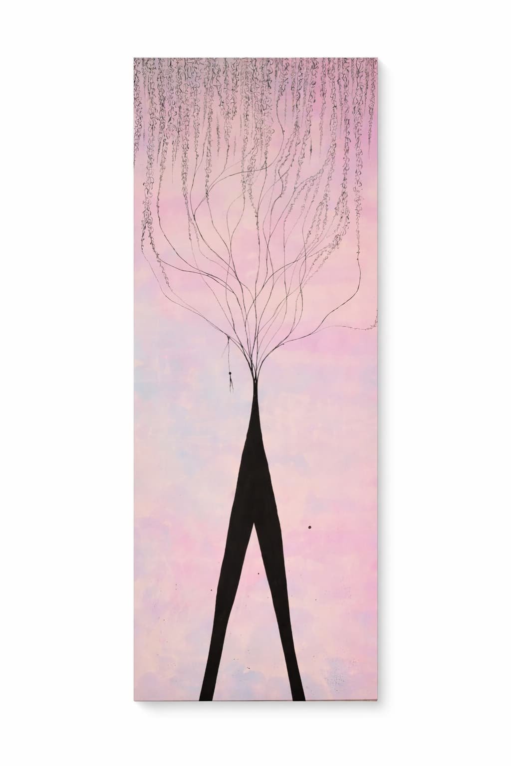 In Story, the artist explores the genesis of narrative through a breathtaking vertical composition. The piece is defined by a dense, intricate canopy of India ink at the top—a chaotic web of “delicate threads” that descend from a soft, pastel sky of lavender and pale blue. These threads do not fall at random; they converge and weave together to form the subtle, muscular silhouette of a creature-tree. The work serves as a profound metaphor for the act of creation. It suggests that every life, and every “story,” begins as a series of disconnected, descending thoughts that eventually gain enough weight and structure to stand. By grounding the figure in a solid obsidian base that stretches upward, the artist illustrates the moment a narrative finds its form, emerging from the atmospheric mists of the subconscious into a physical reality. “A metaphor for the creation found in narrative: the moment a thousand scattered threads become a single, standing truth.”
